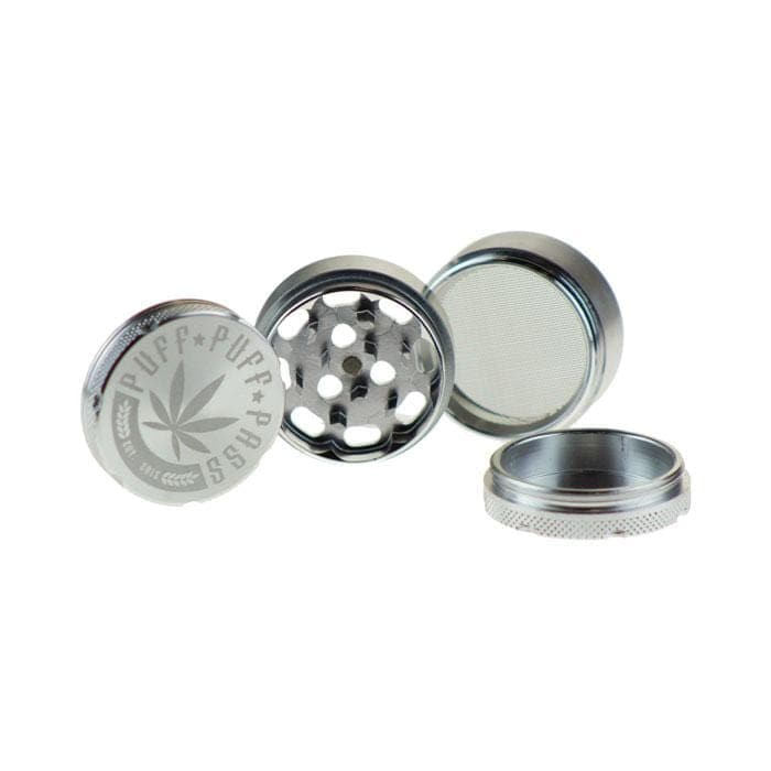 3-Stage C&C Aluminum Puff Puff Pass Aluminum Grinder, 40mm, with scraping tool and fine sifting screen, in gift box.