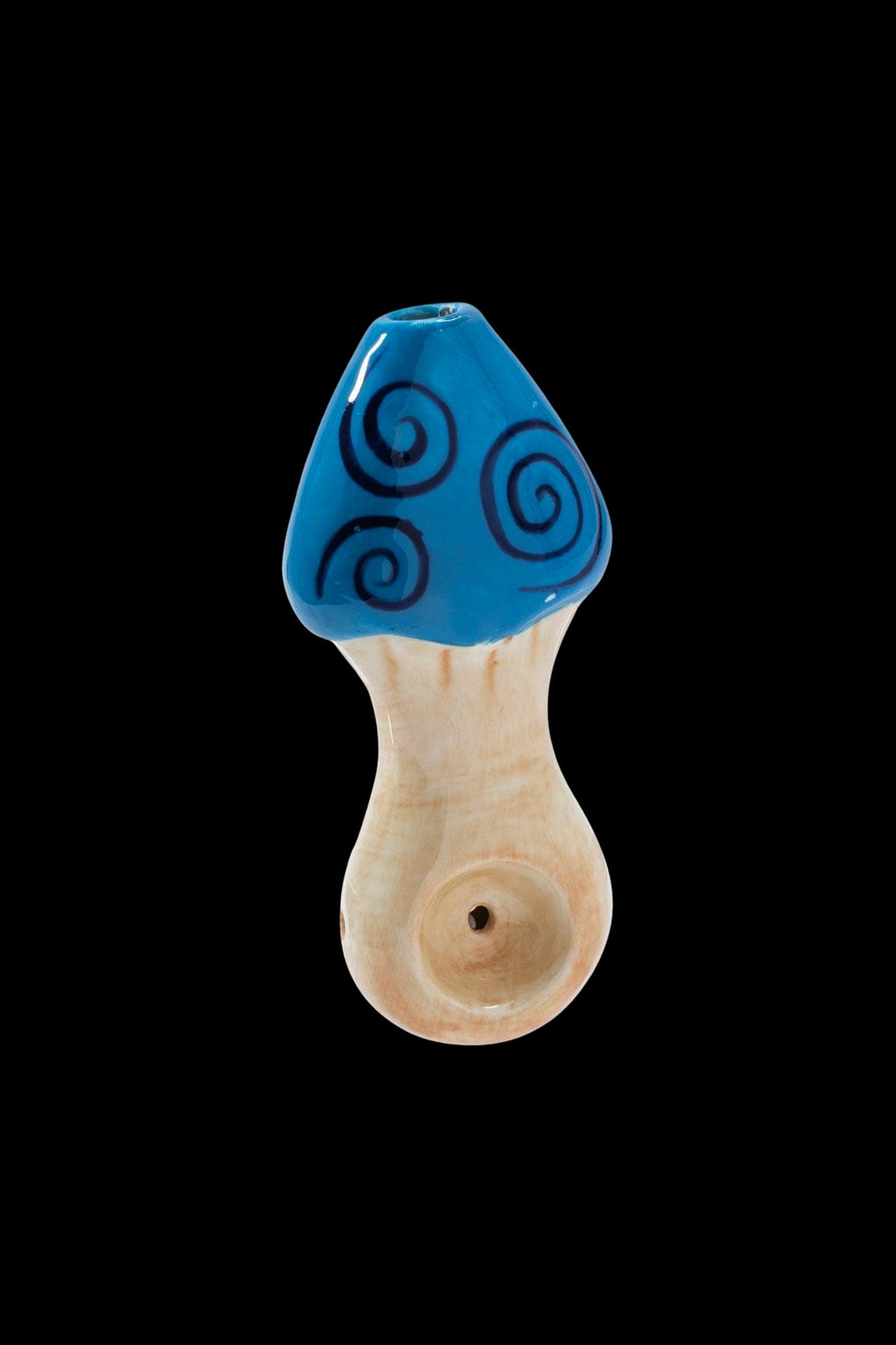 4 inches long Ceramic hand pipe Hand-painted Blue Swirl Mushroom design Compact size Fun and collectible Colorful display-ready packaging